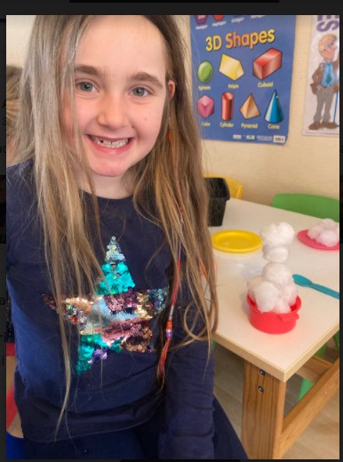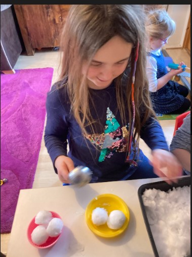 Abigail had fun playing with snow inside making snowmen and ice creams.