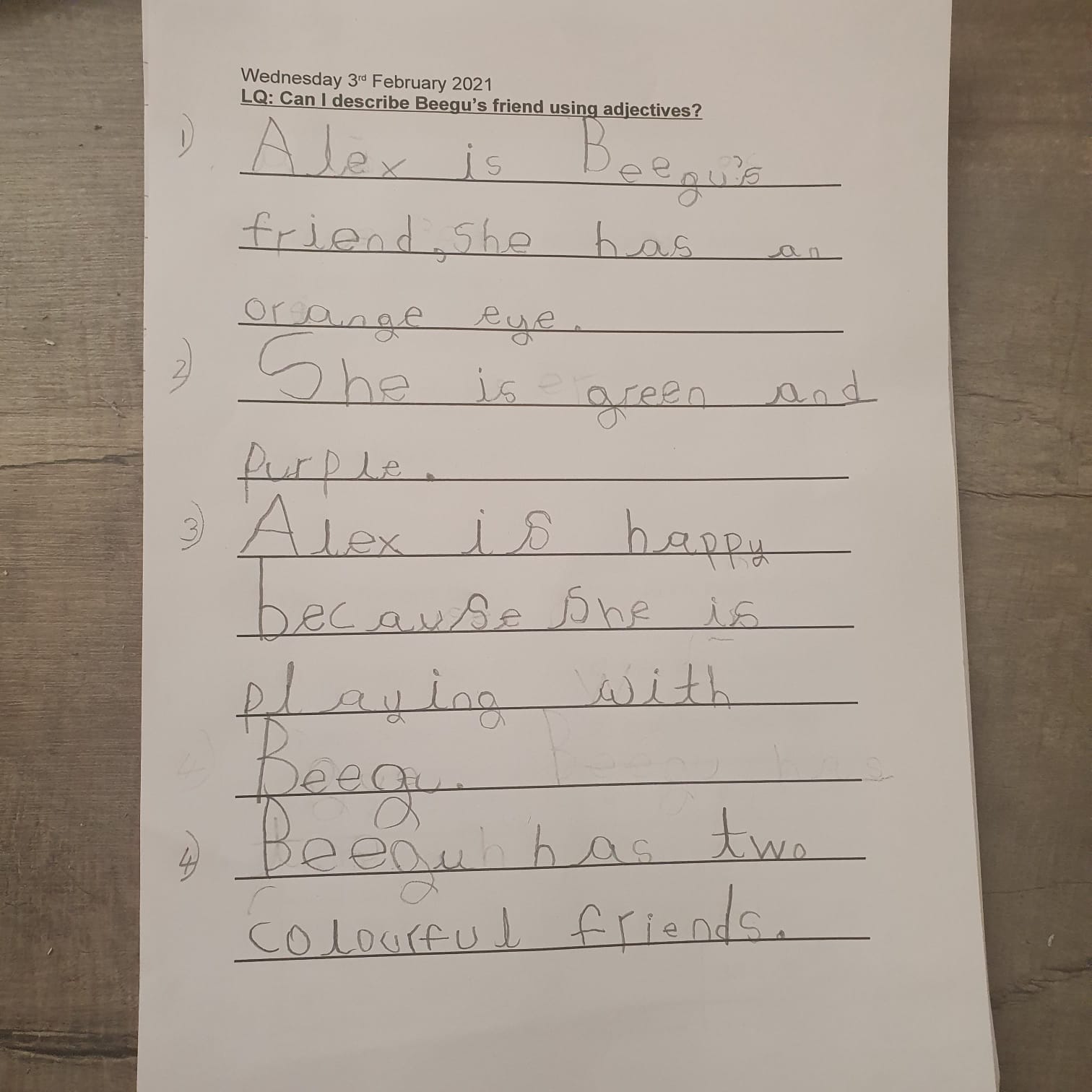 Malique described the colourful friends he made for Beegu the alien using great adjectives.